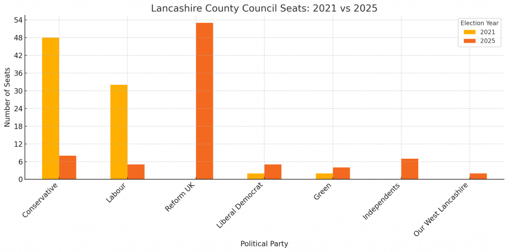 - Assuming a Labour surge that didn’t materialise: Given the 2024 general election landslide for Labour, a projection would likely carry over some of that momentum to the local level. However, in practice Labour’s local campaign was hampered by dissatisfaction with national policy decisions. Labour’s vote share fell dramatically (down over 20 percentage points) in Lancashire, contrary to an expectation that it might hold steady or increase.